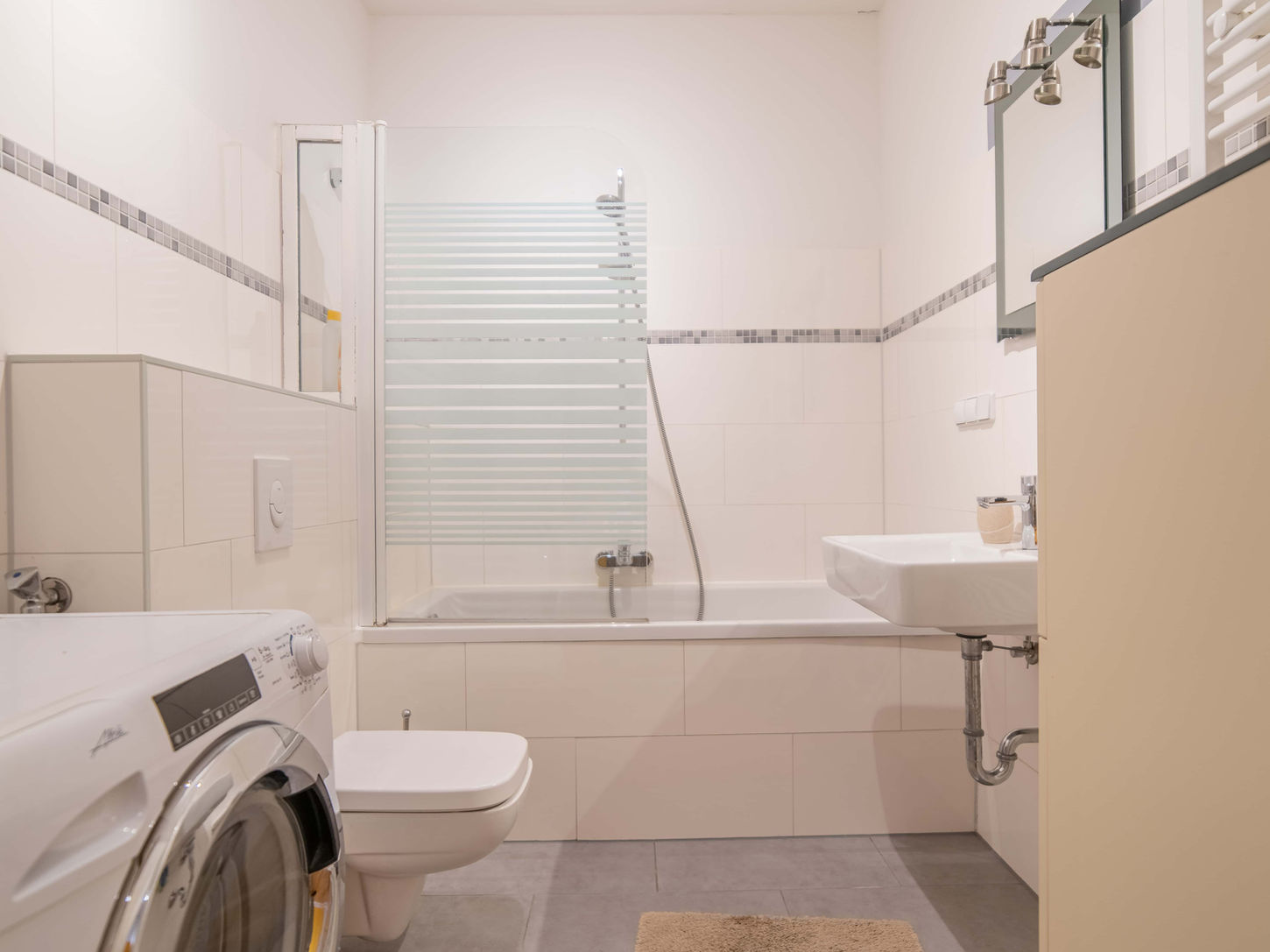 The interior combines character and practicality. The spacious living area benefits from abundant natural light and warm wooden floors, providing a cozy yet elegant environment. Both bedrooms are well-sized, offering ample wardrobe space and pleasant views. The apartment features a modern kitchen equipped with quality appliances and plenty of storage. The bathroom includes a bathtub with glass shower partition and a sleek, contemporary design. Unique design details such as accent walls, decorative elements, and thoughtful lighting—give the apartment a stylish and homely feel.