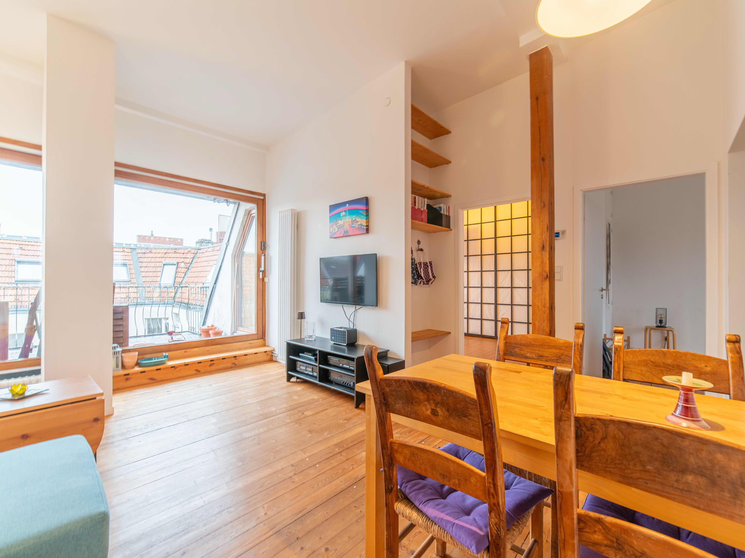 The interior blends warmth and functionality, highlighted by wooden floors, high ceilings, and large skylight windows that brighten every room. The fully equipped kitchen comes with ample counter space and storage, while the modern bathroom includes both a walk-in shower and a bathtub. Carefully selected furniture pieces, built-in shelving, and a comfortable living setup create a welcoming, ready-to-move-in atmosphere.
