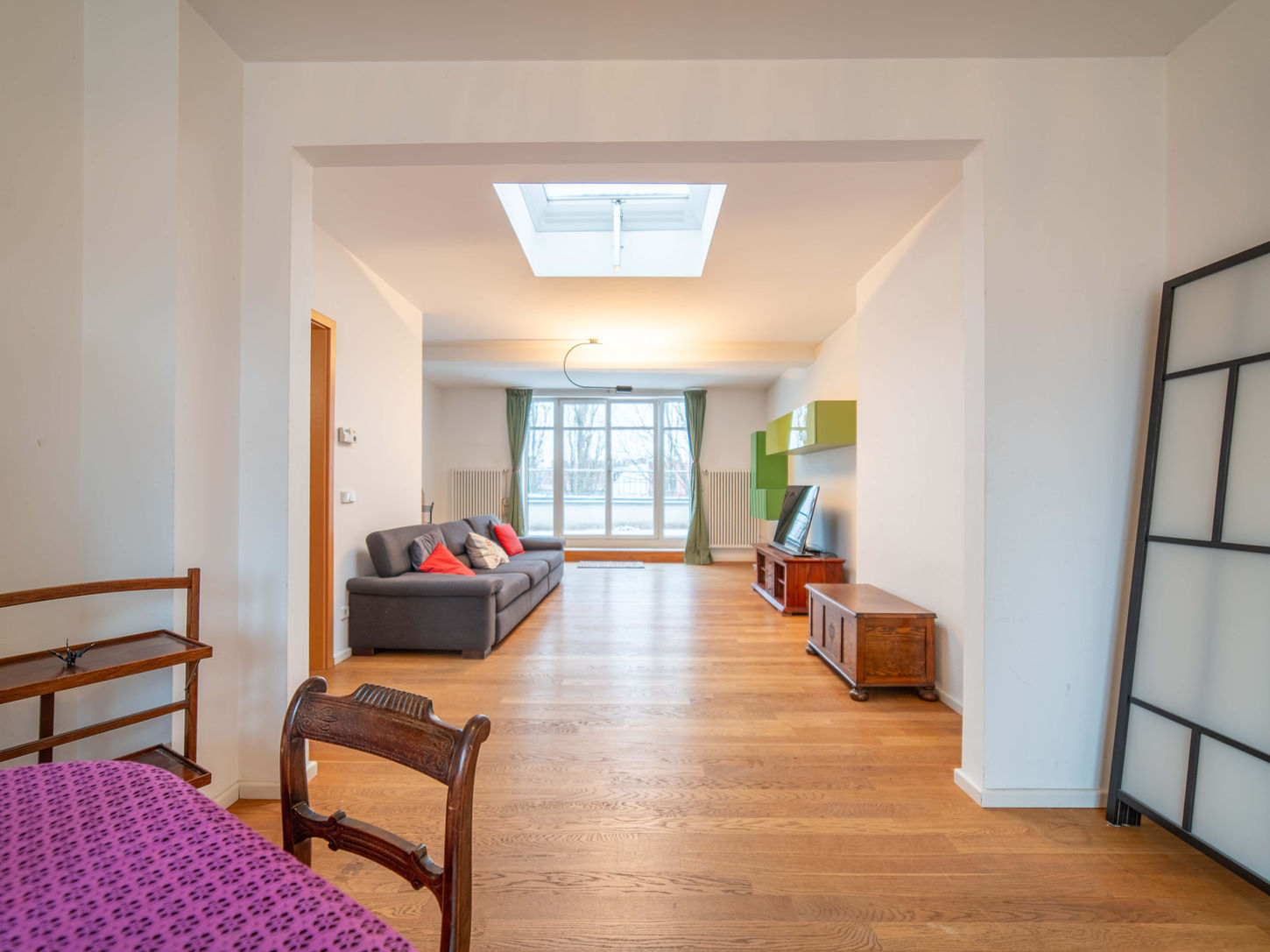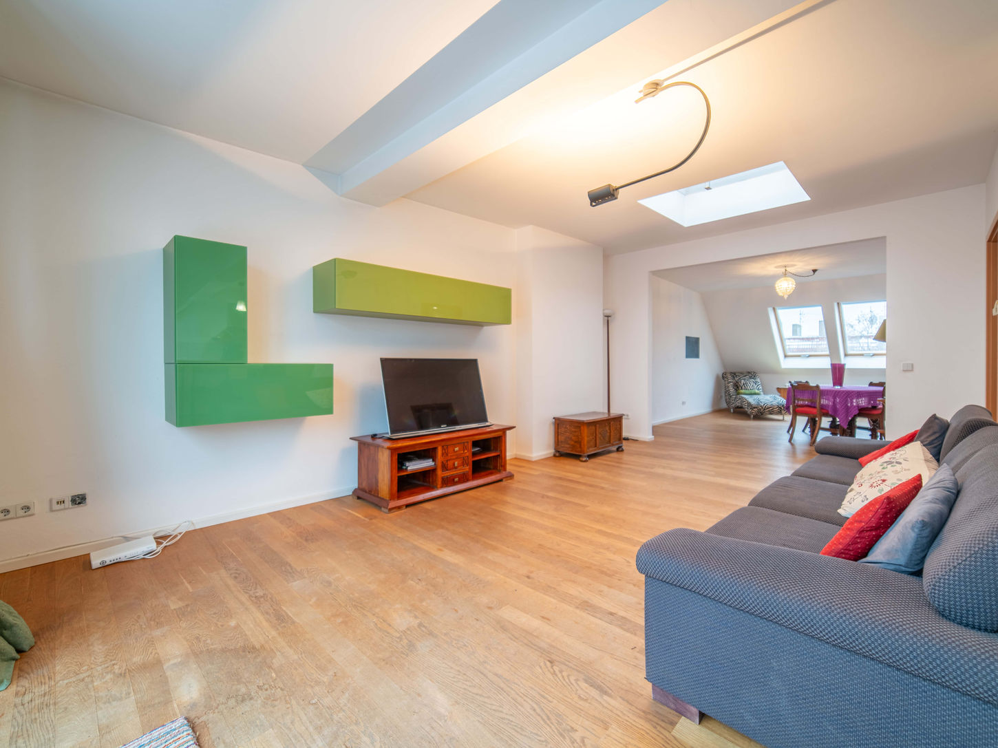 This light‑flooded 3‑room penthouse on Simon‑Dach‑Straße offers two bedrooms, a large open living and dining area, a separate kitchen, two bathrooms (one with bathtub and bidet, one with shower and WC) and a generous rooftop terrace. Thanks to the many skylights and floor‑to‑ceiling windows, the apartment feels bright and open all day, making it ideal for couples, small families or anyone who values space and comfort.